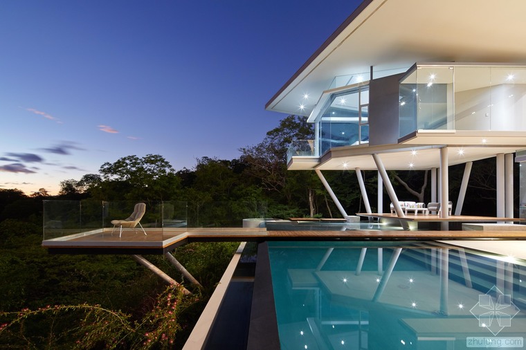 Indios Desnudos 別墅在加約半島,位處于朝海的一個尖端處,略向下傾斜的半島形山脊,兩邊有森林(其中一個是自然保護(hù)區(qū))。這個名字來自于場地里最有特點(diǎn)的一些樹:indio desnudo(赤裸的印第安人),它們組成了別墅的一個焦點(diǎn),特別在居住區(qū)。別墅的設(shè)計(jì)旨在讓人享受室外生活和視野。因此,它被設(shè)計(jì)成在沒有空調(diào)的條件下仍然能舒適生活的建筑。室內(nèi)空間與室外空間相整合,在室內(nèi)的同時感覺像在室外。所有的居住空間都有通向大?;蚴巧直Wo(hù)區(qū)的視野。它有其主要的通向大堂的通道,你可以通過它看到社交區(qū)和大海。從這里你可以使用像木棧道一樣的走道,懸在分散的河石上,組成了流線的兩條軸線,組成樓層平面圖,或者使用樓梯通過橋梁到達(dá)兩個主臥室。