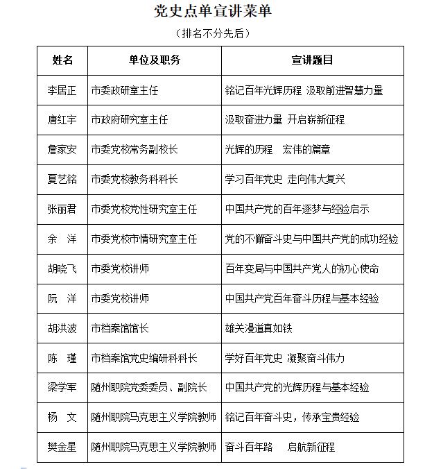 為慶祝中國共產黨成立100周年,深入學習貫徹習近平新時代中國特色社會主義思想,推動黨史學習教育扎實開展,市黨史學習教育辦公室組織黨史學習教育市委宣講團專家精心備課,形成了一批黨史專題宣講精品課程,從即日起面向市直部門、國有企業、高等院校及基層單位提供點單宣講服務。 各地各單位如有宣講需要,可向市黨史學習教育辦公室宣講工作組提出書面申請,宣講工作組協調推薦宣講專家,聯系人:熊小瓊,聯系電話:0722-3593137。宣講情況報市黨史學習教育辦公室宣講工作組備案。 |
