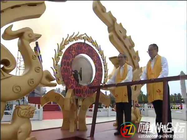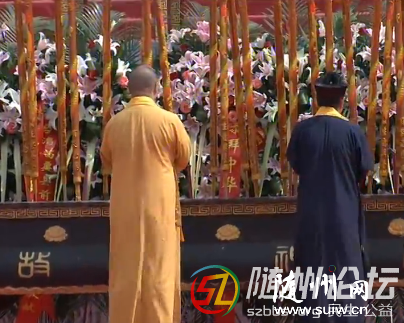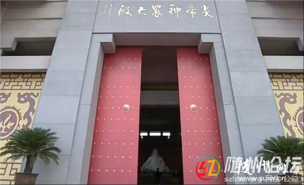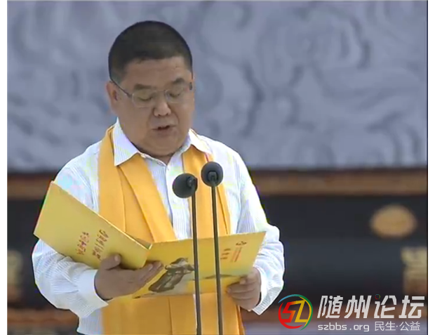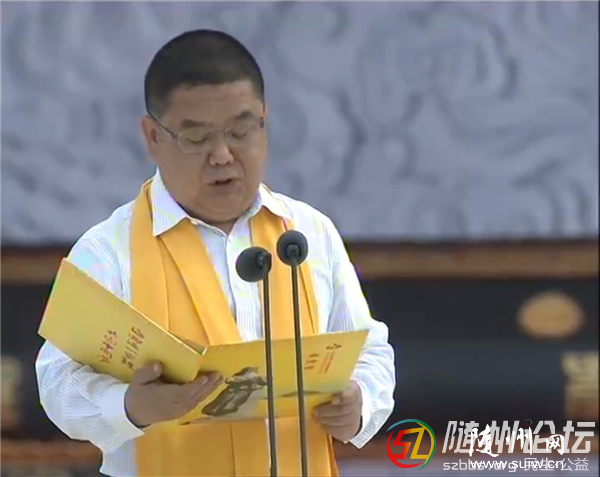 ——恭啟圣門。全國政協副主席馬飚和中共湖北省委書記、省人大常委會主任李鴻忠共同開啟炎帝神農大殿圣門。