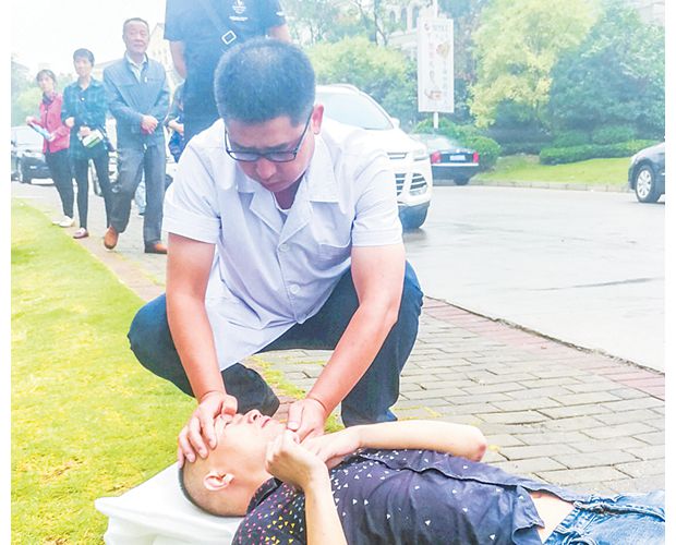 社區(qū)衛(wèi)生室醫(yī)生陳曉波正在現(xiàn)場為病人按壓穴位救治。(本報(bào)記者 李文軍攝)