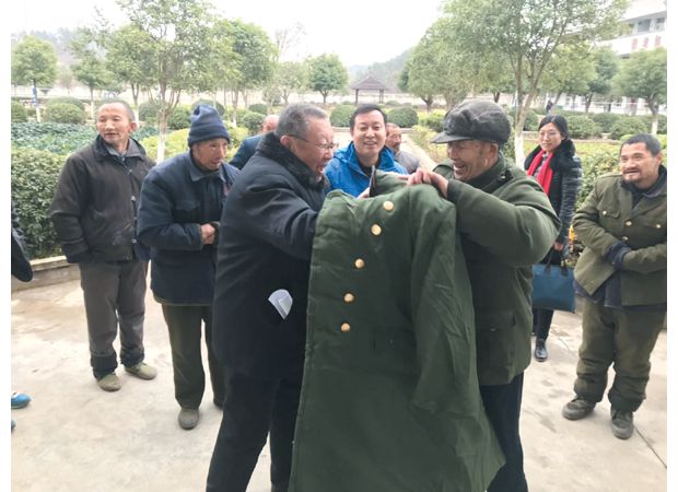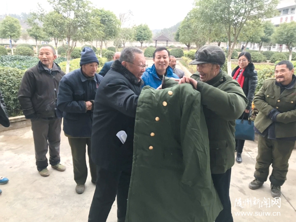 隨州新聞網訊 連日來寒風呼嘯,冷氣襲人。本報曾經報道過的“最美門衛爺爺”蔣從洪牽掛著福利院孤寡老人冷暖,他又拿出省吃儉用的10000元上街購買了100件棉大衣和100雙棉鞋,12月6日,專程送到曾都區何店鎮福利院孤寡老人手中。圖為蔣從洪(前左)為老人穿大衣。(隨州日報全媒體記者 唐天才 通訊員 朱道全攝)