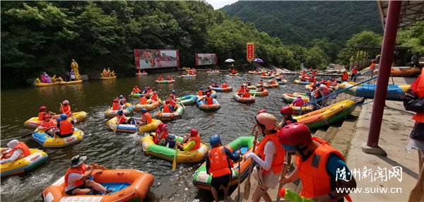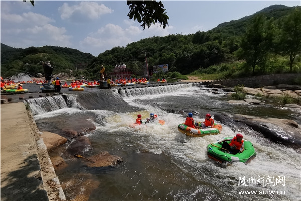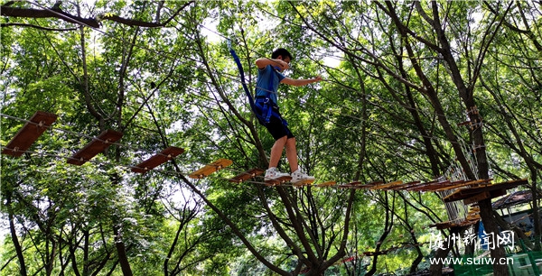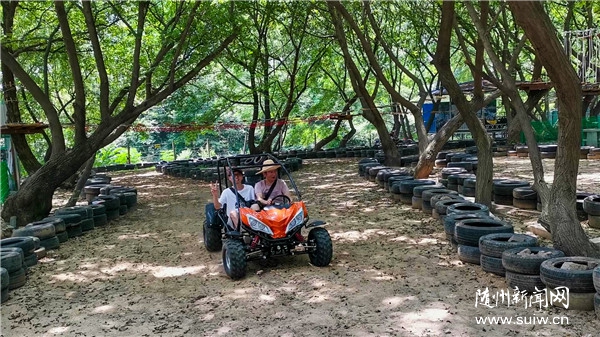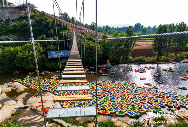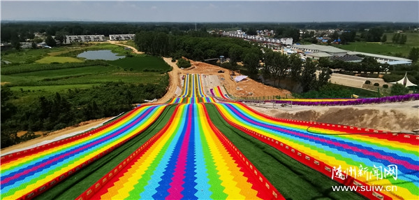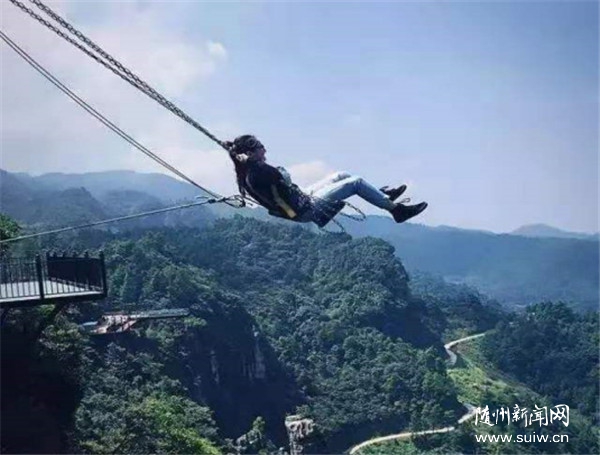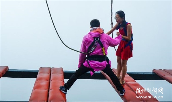隨州市樂通旅游設備有限公司與西游記漂流合作,一期投資3000萬元打造鄂豫皖首家極限綜合運動樂園,建設玻璃棧橋、七彩滑道、極限滑草、叢林穿梭、網紅橋、懸崖秋千等10余個極限運動項目,計劃用5年時間將西游記漂流打造成年旅游收入過億元的鄂北四季生態旅游中心。圖為7月4日正在收尾施工的高空玻璃棧橋和七彩滑道項目。(隨州日報全媒記者 李文軍攝)