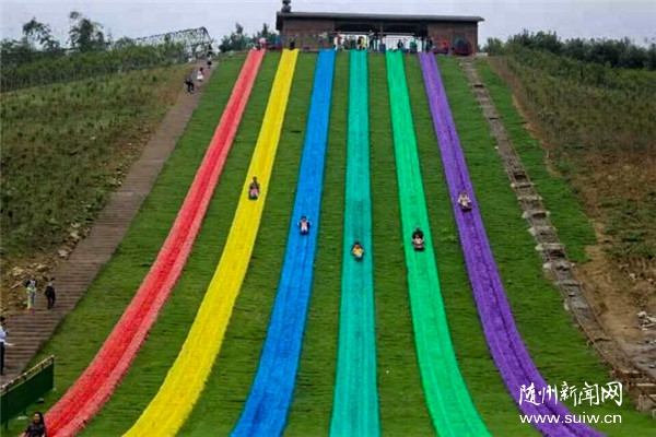 2.七彩滑道遠遠望去,猶如一道道七色彩虹,燦爛奪目,四面青山繞綠水,環境優美。此項目建于漂流終點左側山坡。