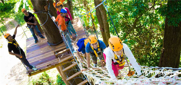 4.叢林穿越是一項在樹上進行的探險項目,集冒險、運動、娛樂、挑戰于一體的戶外運動項目,玩家需要通過懸空橋梁、網道、步道、木道、泰山秋千、飛狐索道和其他趣味環節等方式進行樹木間的探險,通過爬、滑、游、跨、跳、飛等動作越過所有障礙到達終點。(此項目建于漂流河邊停車場槐樹林中 )