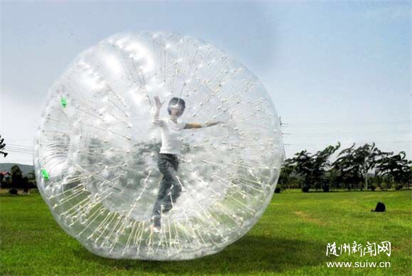8.悠波球由一個直徑3m的外球和一個直徑2.8m的內球組成,通常是從較為帶有一定坡度的綠地滾下來,里面的人會隨著球體做365度旋轉,可以同時體驗失重與旋轉的雙重刺激,非常過癮。此項目建于滑草場左側。