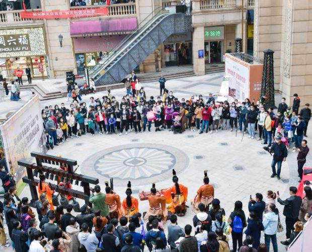 巡演首場在武漢音樂學院舉行。活動現場,當縮小版的“曾侯乙編鐘”組裝完成,該學院的學子們紛紛上前嘗試敲響這一古老的打擊樂器。市博物館編鐘樂團人員現場講解國寶曾侯乙編鐘的傳奇經歷、發聲原理、珍貴價值等,并現場演繹編鐘樂舞。下午,編鐘樂舞快閃巡演來到武漢年輕人聚集地光谷步行街。當悠揚靈動的編鐘古樂在人來人往的繁華街頭敲響,古典與現代的碰撞、空靈與鬧市的映襯,讓隨州的編鐘樂舞成功吸晴,成了光谷步行街全場最受矚目的秀。現場里三層外三層圍滿了市民群眾,大家紛紛舉起手機拍照錄攝。
