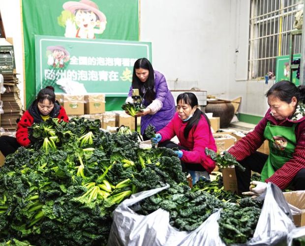 隨縣安居鎮(zhèn)“鮮選農(nóng)家食品”通過現(xiàn)場(chǎng)直播帶貨等方式,將隨州泡泡青推銷到全國(guó)各地,每天接到的網(wǎng)上訂單少則數(shù)百份,多則近千份。圖為“鮮選農(nóng)家食品”一邊組織工人包裝泡泡青,一邊請(qǐng)網(wǎng)紅現(xiàn)場(chǎng)直播。