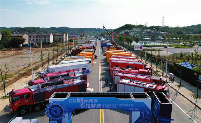 10月11日,2023年湖北省隨州市外經貿融合發展專用車展覽會在隨城星光大道布展完成,來自33家專汽企業的157輛車分為物流類、環衛類、應急類、文旅類、;奉5大類參與展覽展示!。S州日報全媒記者徐斌攝)