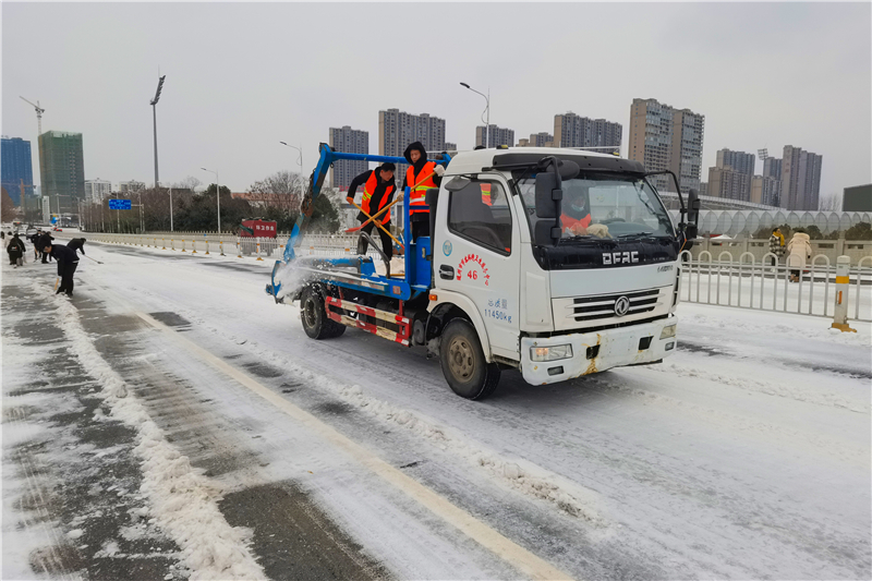 2月21日上午,我市交通城管系統工作人員在波導大橋等主要道路上除雪撒鹽,保障交通暢通。(全媒記者 孫洪濤攝)