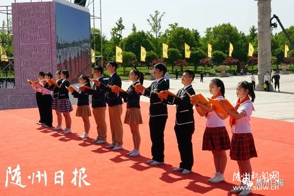 恭讀頌祖文。炎帝故里優秀青少年學生代表恭讀《頌炎帝文》。