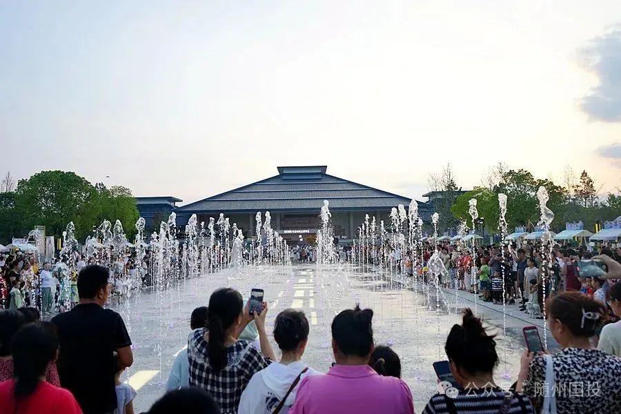 當晚,“炎之有禮·首屆古風文博市集”也在隨州博物館前廣場啟動,廣場中央的旱地噴泉秀在光影映寸下十分夢幻,每次開啟都圍滿了舉著手機拍照的市民。