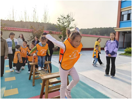 各年級器械操展演接續登場,孩子們伴隨音樂節拍跳躍、擺動,雖動作尚顯稚拙,卻以專注神情與飽滿狀態展現童真風采,贏得家長們此起彼伏的掌聲;親子趣味游戲環節更將氛圍推向高潮,家長與孩子默契協作、互動嬉戲,在歡聲笑語中定格溫馨瞬間。體能大循環設計盡顯教育巧思,內圈為小班幼兒設置低難度趣味闖關項目,外圈為中大班打造進階障礙挑戰,精準契合《3-6歲兒童學習與發展指南》“各年齡段幼兒動作協調、靈敏”的健康領域目標。孩子們在奔跑、跳躍、攀爬間釋放活力,既錘煉了體魄與勇氣,更收獲了成長的滿滿喜悅。