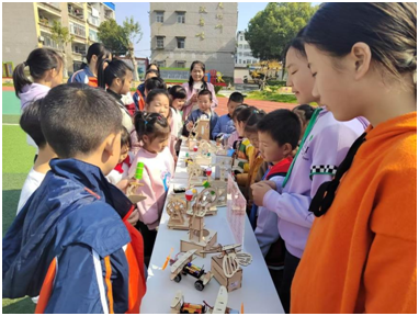 活動當日中午,校園內人頭攢動,氣氛熱烈。在老師們的精心組織下,各年級學生分時段、有序列隊進入展示區參觀。展臺上琳瑯滿目的作品,正是同學們近一個月來利用科學知識,親手設計、反復調試的勞動結晶。從科幻畫作的精心勾勒,到科技小制作的每一個零件組裝,都凝聚著孩子們的智慧與汗水。現場,這些小創作者們自信地擔任起講解員,熱情介紹自己的創意與制作過程,贏得了師生與領導的陣陣掌聲。