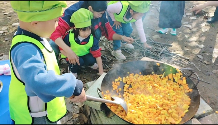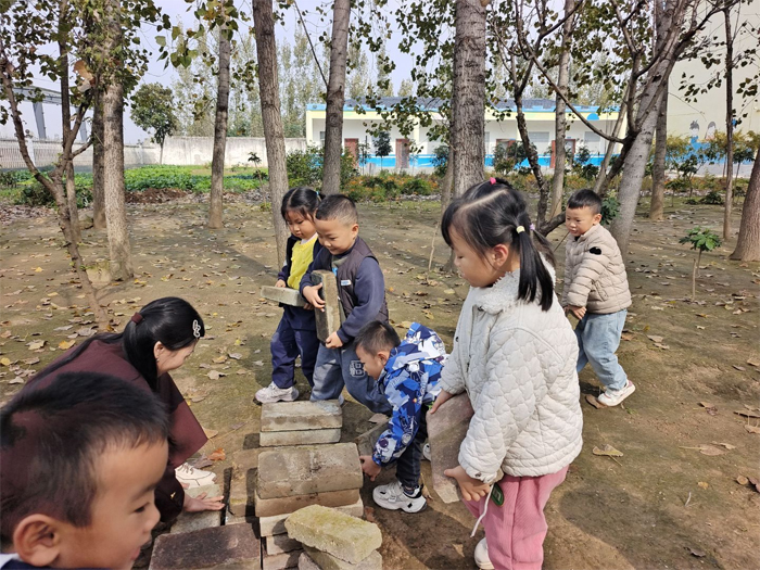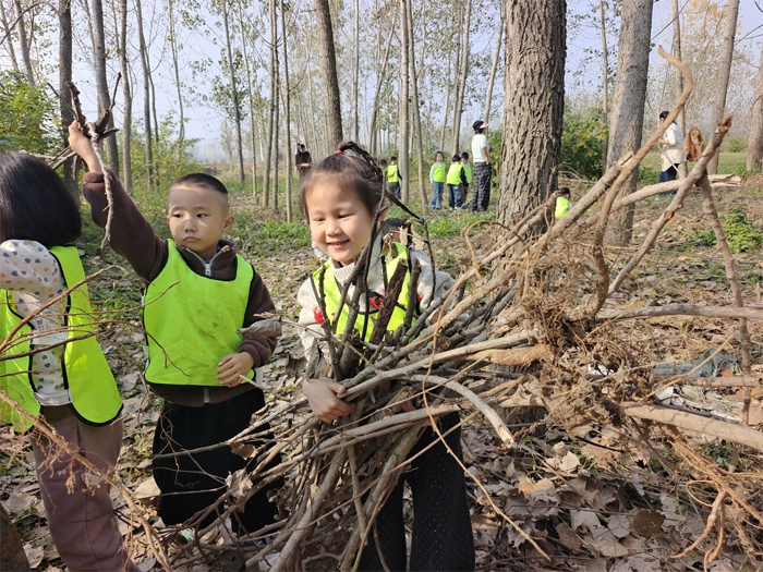 孩子們化身“小小探險家”,邁著輕快的腳步走出教室,在大自然的懷抱中開啟探索之旅。他們彎腰拾起枯枝,感受每一根柴火的紋理與重量,為即將到來的烹飪積蓄能量 。在戶外廚房的空地上,孩子們分工協作搭起灶臺,磚塊堆疊間藏著對“煙火氣”的好奇與期待。