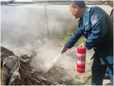 疏散環(huán)節(jié)結(jié)束后,活動進(jìn)入實戰(zhàn)體驗階段。幼兒園安保老師化身為“安全教練”,現(xiàn)場演示了滅火器的正確使用方法,并詳細(xì)講解了“提、拔、握、壓”四字操作口訣。在模擬火源前,老師手持滅火器,果斷按下壓把,白色干粉迅速覆蓋火點,成功將“火情”撲滅,生動直觀的演示贏得了孩子們的陣陣掌聲。