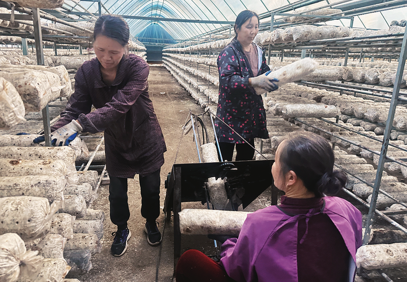 在石廟村香菇種植基地大棚內,村民們默契配合為碼放整齊的菇棒打孔。(全媒記者黃芳芳攝)