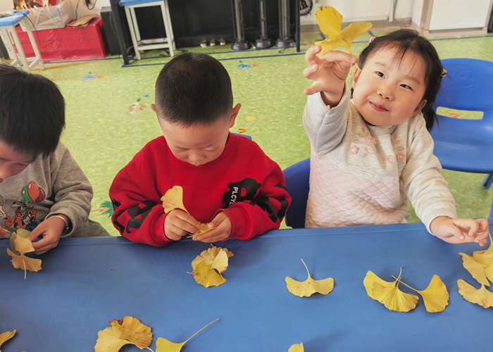 活動始于一場“自然觀察課”:老師帶著孩子們圍站在銀杏樹下,引導大家觀察葉片“像小扇子”的形狀、觸摸葉片的手感,還借著飄落的黃葉,和孩子們聊起“秋天為什么樹葉會變黃”的小知識——這恰好呼應了指南中“支持幼兒在接觸自然中積累感性經驗”的要求。隨后在活動室里,孩子們用金黃落葉或合作或獨立DIY“銀杏皇冠”,有的疊出“花瓣形”裝飾,有的圍成一個圓形。老師巡回指導,既保護創作自主性,也落實指南“鼓勵幼兒用多元材料表達自己的想法”的建議。