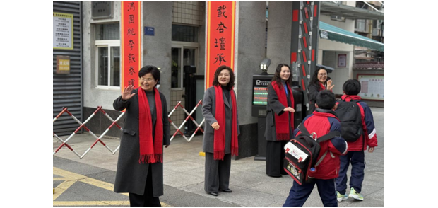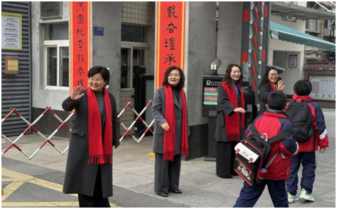 在校門口,校長、老師們與禮儀志愿者微笑相迎,用親切問候與溫暖擁抱迎接每一位學子歸來。