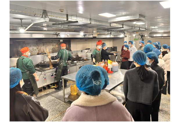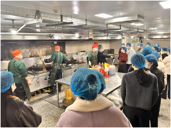 活動當天,家長們從學校正門簽到入場,在工作人員引導下,依次參觀廚房、儲存間、操作間、備餐間、售賣間等功能區域,詳細了解食材采購、加工制作、餐具消毒及刷卡消費等環節。干凈整潔的環境、規范有序的操作,讓家長們直觀感受到學校食堂的精細化管理。
