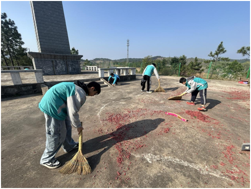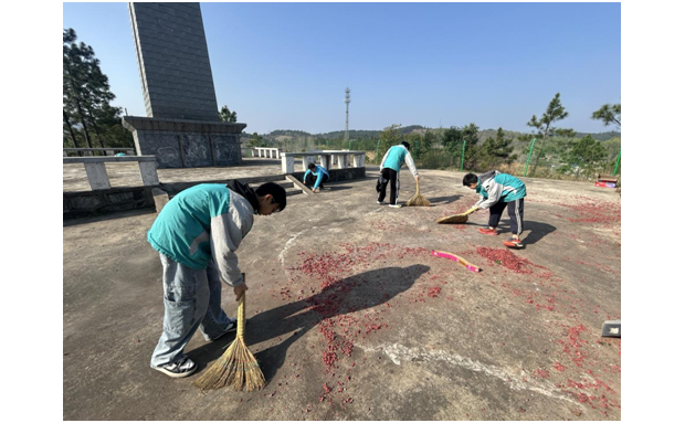 儀式結束后,同學們有序來到烈士紀念碑周邊的烈士墓前,仔細聆聽、認真了解每一位烈士的英雄事跡,追尋紅色足跡,銘記革命歷史。與此同時,部分學生主動拿起掃帚、抹布等清潔工具,認真打掃烈士墓周邊的環境衛生,細心擦拭墓碑,用實際行動呵護先烈的安息之地,以點滴行動表達對革命先烈的敬仰與緬懷。