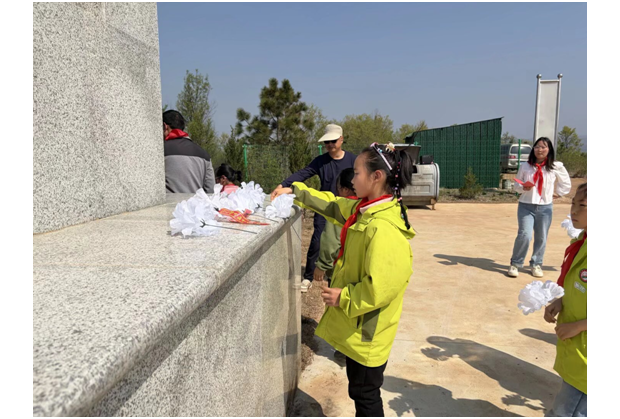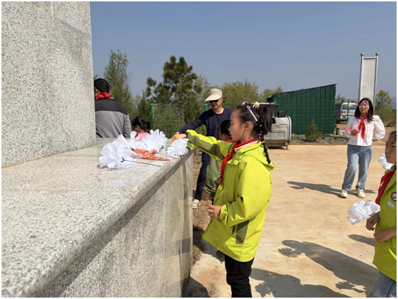 在烈士紀念碑廣場,祭掃儀式莊重開展,教師代表講述了元寶山本地從抗戰到解放戰爭的紅色歷史與先烈事跡,學校領導致辭緬懷先烈并號召師生傳承紅色精神,全體少先隊員在大隊長帶領下重溫入隊誓詞,之后師生有序向紀念碑敬獻小白花、鞠躬瞻仰。