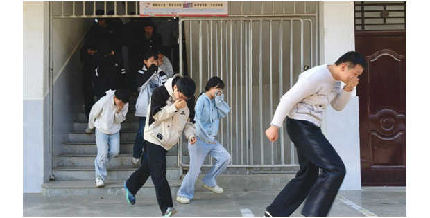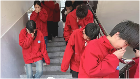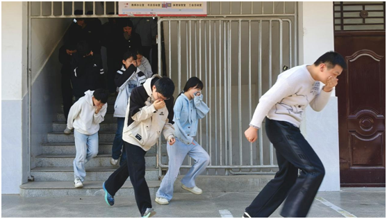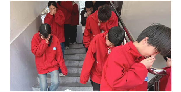 隨著警報聲響起,演練正式開始。全校師生迅速行動,在班主任和任課教師的引導下,學生們貓腰弓身,用毛巾、衣袖等掩住口鼻,按照“前半部分走前門、后半部分走后門”的要求,有序撤離教室,在走廊排成兩路縱隊靠右下樓。各教學樓樓梯口指揮員各司其職,在志遠樓、騏驥樓各樓層引導疏散,全程做到不慌張、不擁擠、不停留。全體師生僅用3分52秒,就安全、快速疏散至學校大操場指定位置,各班體育委員迅速清點人數并向副總指揮汪德剛匯報,整個疏散過程緊張有序、銜接順暢。