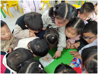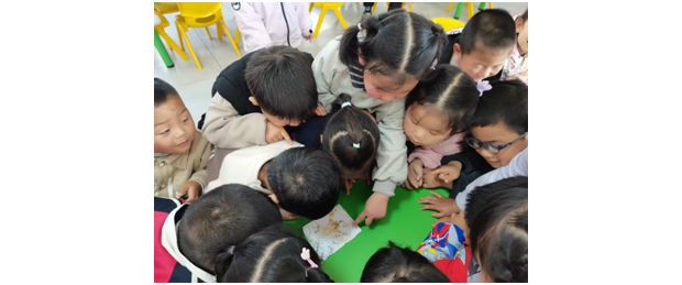 活動伊始,教師通過趣味視頻向孩子們展示了蠶卵孵化的全過程。隨后,孩子們圍坐在一起,仔細觀察真實的蠶卵與剛孵化的蟻蠶,他們睜大好奇的雙眼,認真尋覓著細微生命的蹤跡,在看一看、說一說的過程中,直觀認識了蠶的初始形態,真切感受到生命誕生的奇妙。