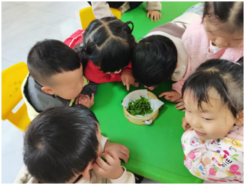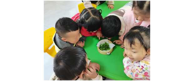 在認識蠶寶寶的同時,孩子們還了解了它們的專屬食物——桑葉。大家近距離觀察蠶寶寶啃食桑葉的模樣,親手觸摸桑葉,感受葉片柔軟光滑的質感,在親身體驗中加深了對蠶寶寶生活習性的認知。