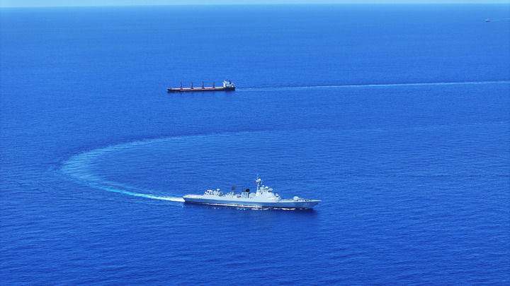 中國海軍第46批護航編隊焦作艦(下)護送貨船至解護點后與之分航(2024年5月7日攝)。新華社發(張大禹 攝)