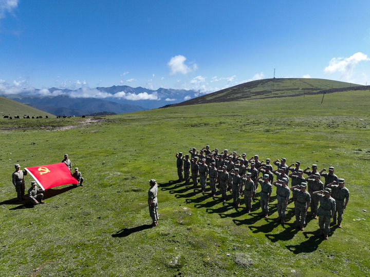 西部戰區空軍某團遠程機動訓練途中組織官兵舉行重溫入黨誓詞活動(2025年6月30日攝,無人機照片)。新華社發(鄧世寧 攝)