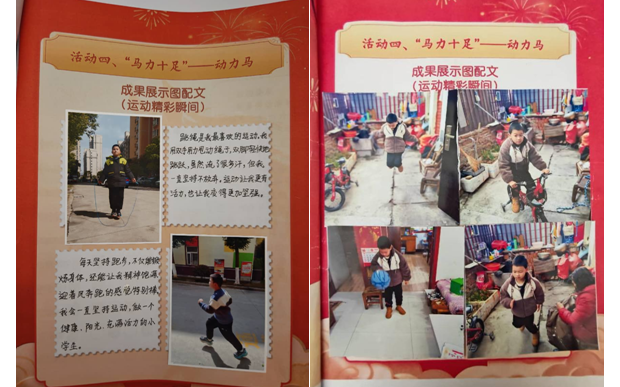 學(xué)校以視頻展示的方式,分板塊精彩呈現(xiàn)實(shí)踐成果:“規(guī)劃馬”板塊生動展示了學(xué)生制定的寒假時間表及學(xué)習(xí)、運(yùn)動與生活目標(biāo);“智慧馬”展區(qū)中,好詞好句的積累工整規(guī)范,彰顯智慧火花;“動力馬”以圖文并茂的形式記錄跳繩、跑步等運(yùn)動瞬間,充滿蓬勃朝氣;“勤勞馬”通過家務(wù)打卡表,涵蓋疊被、洗碗、整理房間等日常勞動,體現(xiàn)辛勤付出;“傳承馬”則展示了學(xué)生抄寫的春聯(lián),以及包餃子、學(xué)做年節(jié)美食等傳統(tǒng)文化體驗,濃郁傳承韻味。