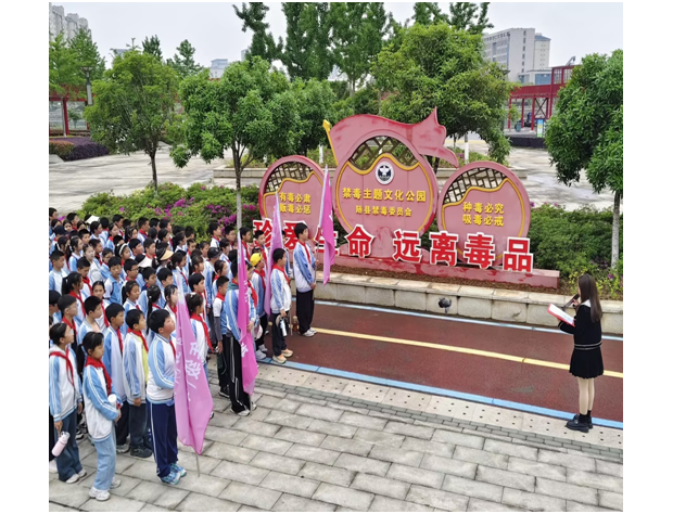 隨后,五年級全體師生徒步前往隨縣禁毒主題文化公園,在老師的帶領下有序參觀廣場內的主題展區,全面學習禁毒歷史、相關法規及禁毒工作成果,直觀了解傳統毒品與新型偽裝毒品的特征與危害。學生們通過自由參觀、互動交流、共同探討,進一步加深了對毒品危害的認知,有效提升了自我防范與自我保護能力。活動尾聲,學生們莊嚴宣誓,立下抵制毒品、守護青春的堅定誓言,并在禁毒主題橫幅上鄭重簽名,以實際行動踐行“珍愛生命、遠離毒品”的承諾。