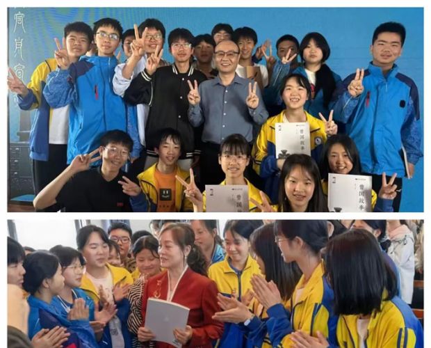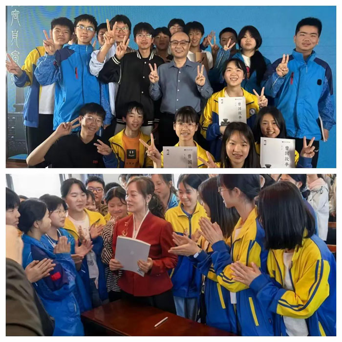 同學(xué)們簇擁著楊館長,爭相與他握手、合影。鏡頭里,一張張笑臉燦爛而靈動——有的眼神發(fā)亮,有的比出“耶”的手勢,有的緊緊握著楊館長的手不肯松開。那份發(fā)自內(nèi)心的興奮與自豪,被一一定格。