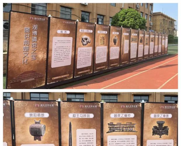 一塊塊圖文并茂的文物展板依次介紹湖北省博物館十大“鎮(zhèn)館之寶”:鄖縣人頭骨化石、石家河玉人像、崇陽銅鼓、越王勾踐劍、曾侯乙曾盤、曾侯乙編鐘、彩繪人物車馬出行圖、虎座鳥鼓架、云夢睡虎地秦簡、元青花四愛圖梅瓶。全方位呈現(xiàn)荊楚文化的璀璨奪目與博大精深。
