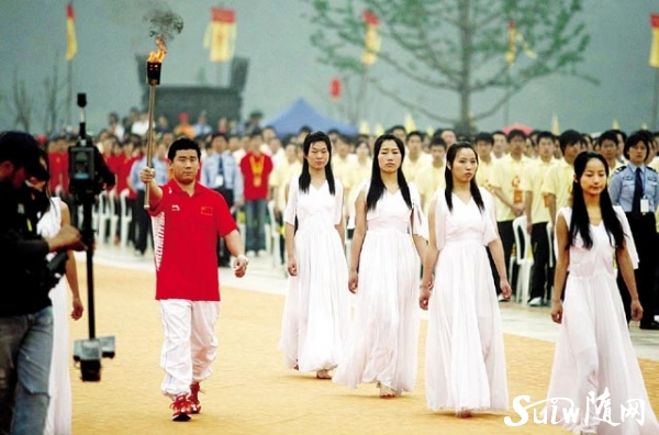 圖為 奧運冠軍鄭李輝(左)在白衣少女的護衛下傳遞圣火。