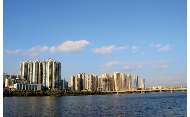 7月28日,隨州的天格外的藍。站在白云湖大壩上,藍天、白云、高樓、綠樹與一湖碧水相倒影,形成了一幅美麗的畫卷。